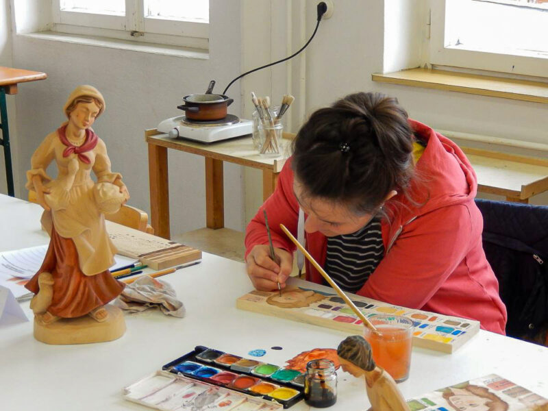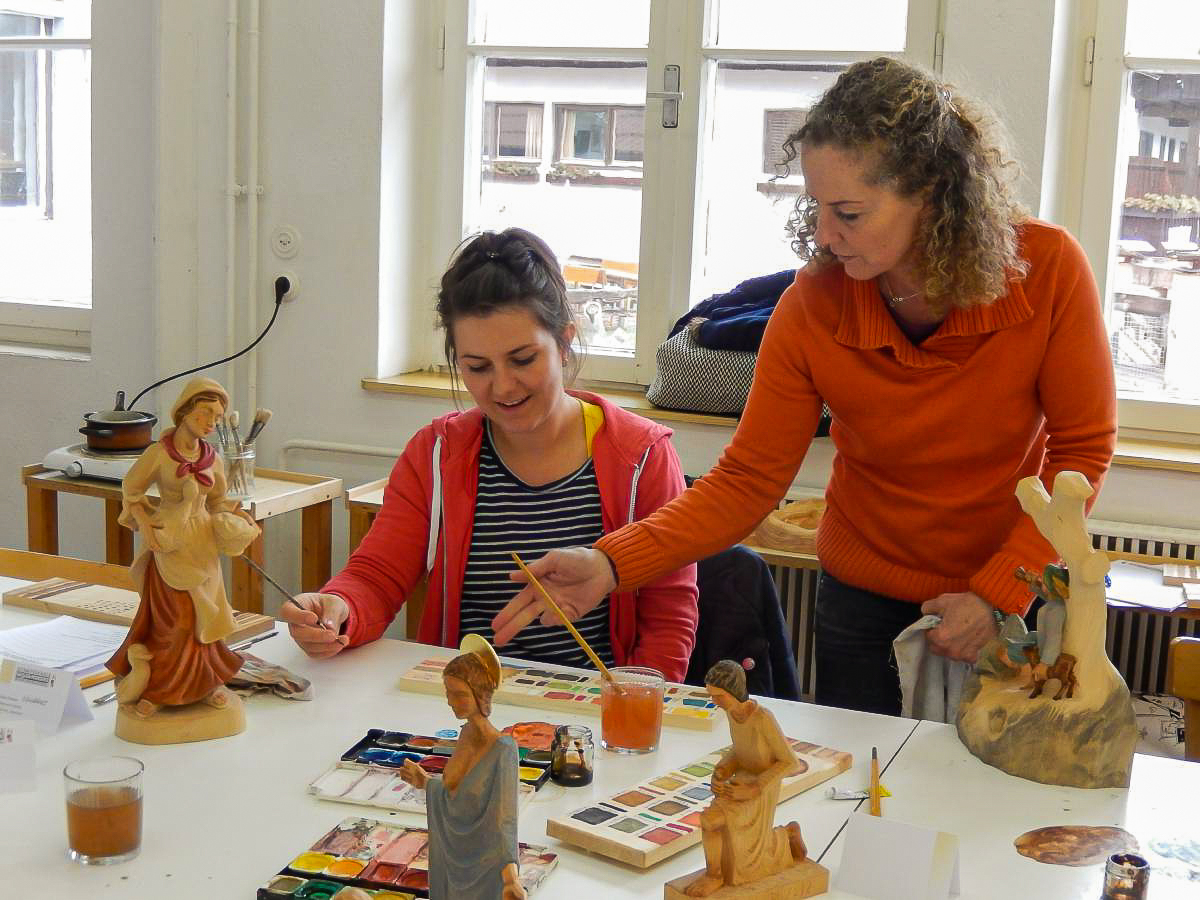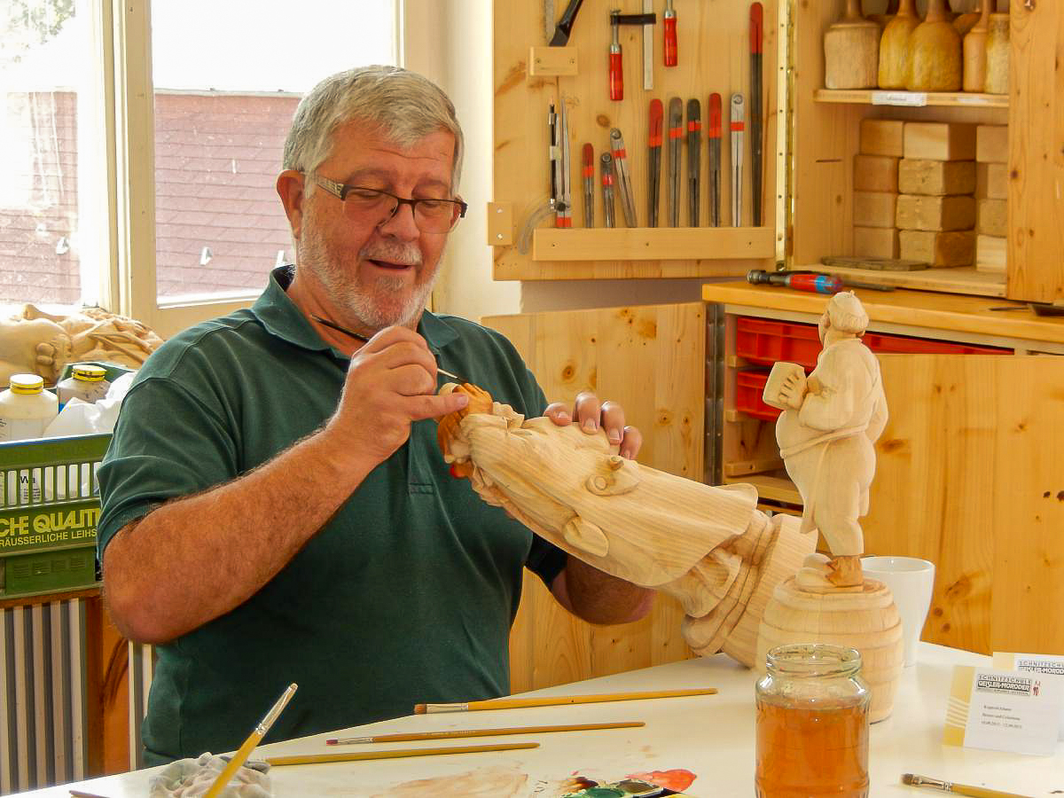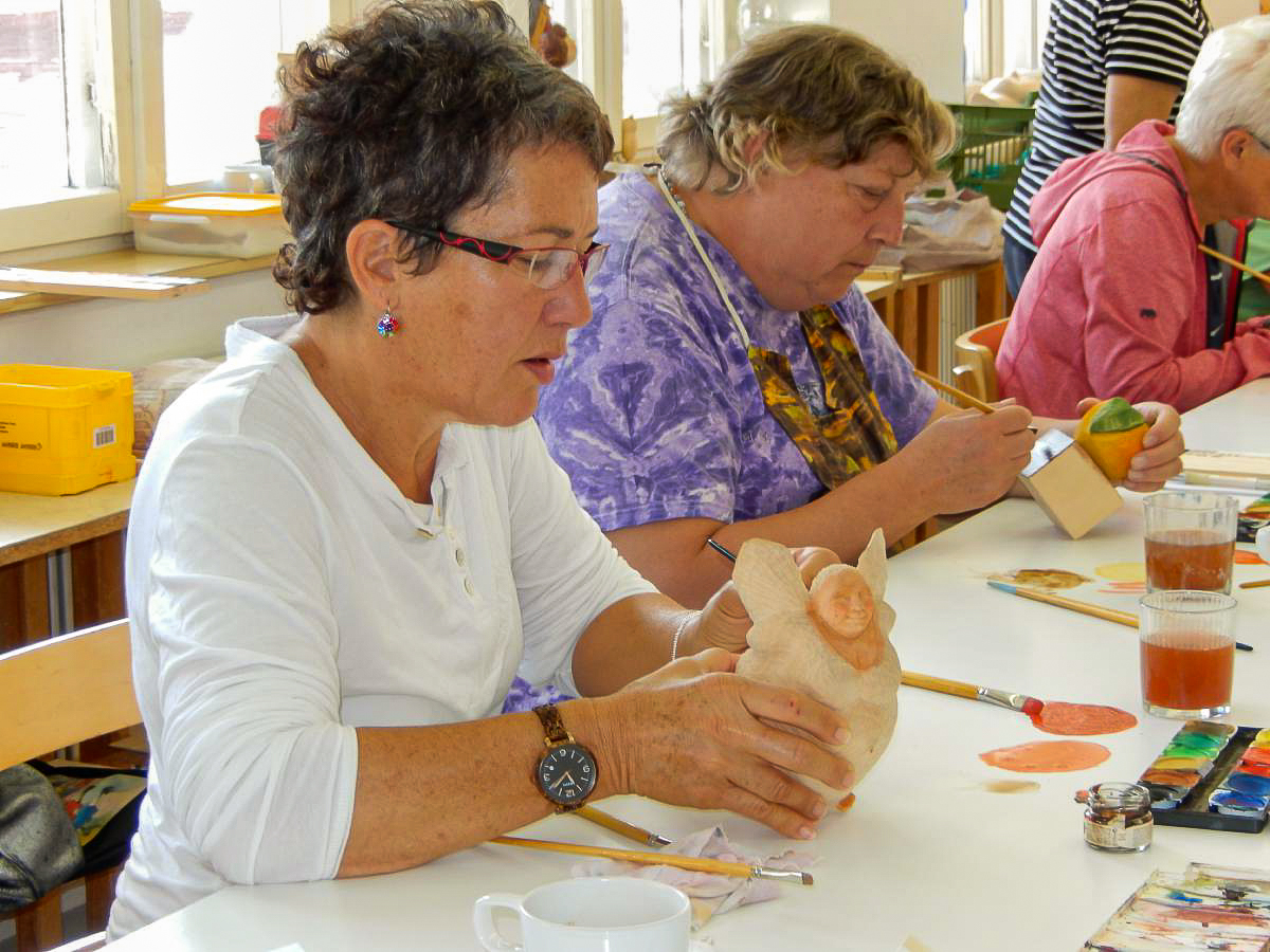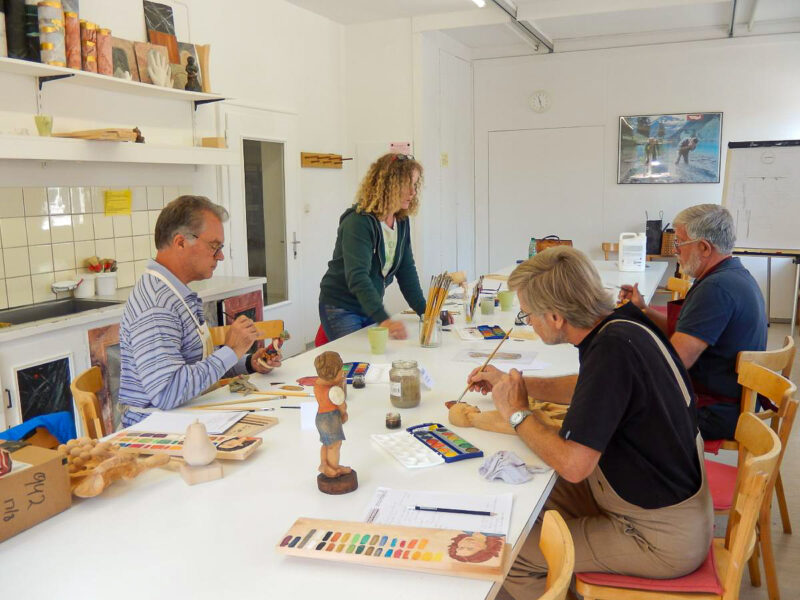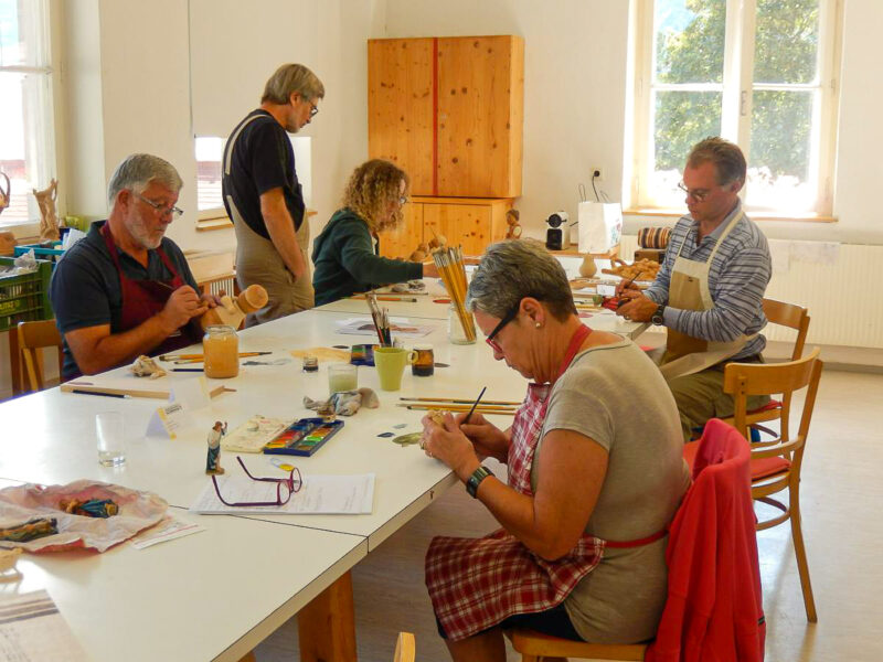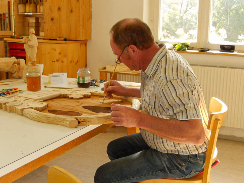 Es werden Ihnen die grundlegenden Arbeitsschritte zum Beizen und Bemalen von traditionellen Schnitzereien vermittelt. Sie erlernen das einfärbige Beizen, das Mehrtonbeizen