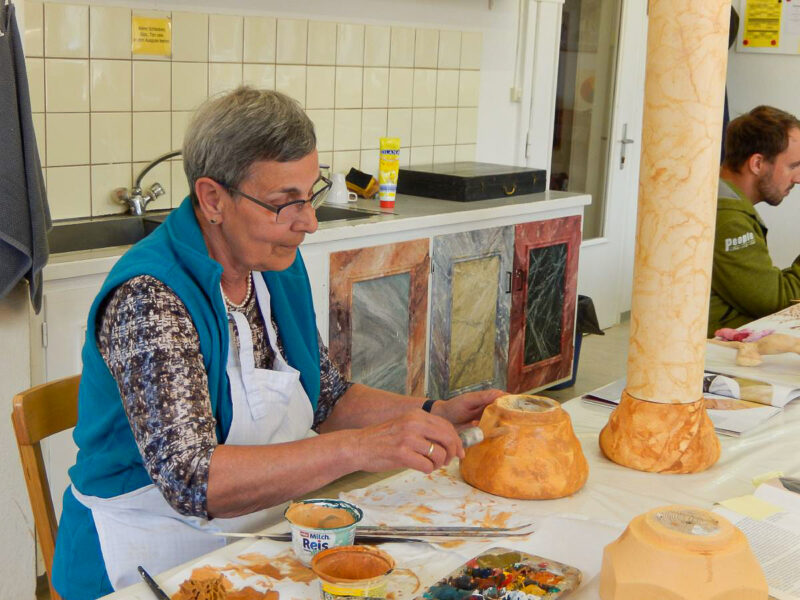 In diesem Kurs lernen Sie die verschiedenen Techniken der farblichen Gestaltung kennen und arbeiten mit unterschiedlichen Materialien. Farbenlehre, Farbentheorie und Mischtechniken werden vermittelt. Außerdem üben Sie die deckende und lasierende Bemalung von Skulpturen und Objekten für den Innen- und den Außenbereich. Dabei kommen Öle, Wachse, Lasuren, Acryl- und Ölfarben zur Anwendung. Weiters erlernen Sie die naturgetreue Reproduktion einer Marmoroberfläche! Der Einsatz dieser Technik wird für die Raumgestaltung und für großflächige Dekorationen im Wohnbereich genutzt. Mit der Kammzugtechnik lassen sich Effekte erzielen, die besonders beim Restaurieren alter Möbel hilfreich sind. Das Anfertigen von Arbeitsproben gibt dabei die notwendige Sicherheit. Praktisches Üben und Ausprobieren stehen im Vordergrund.