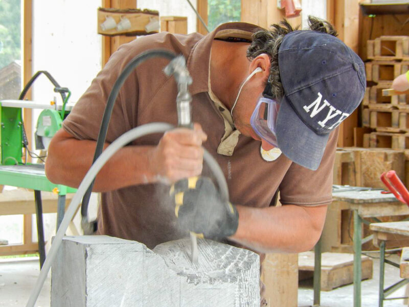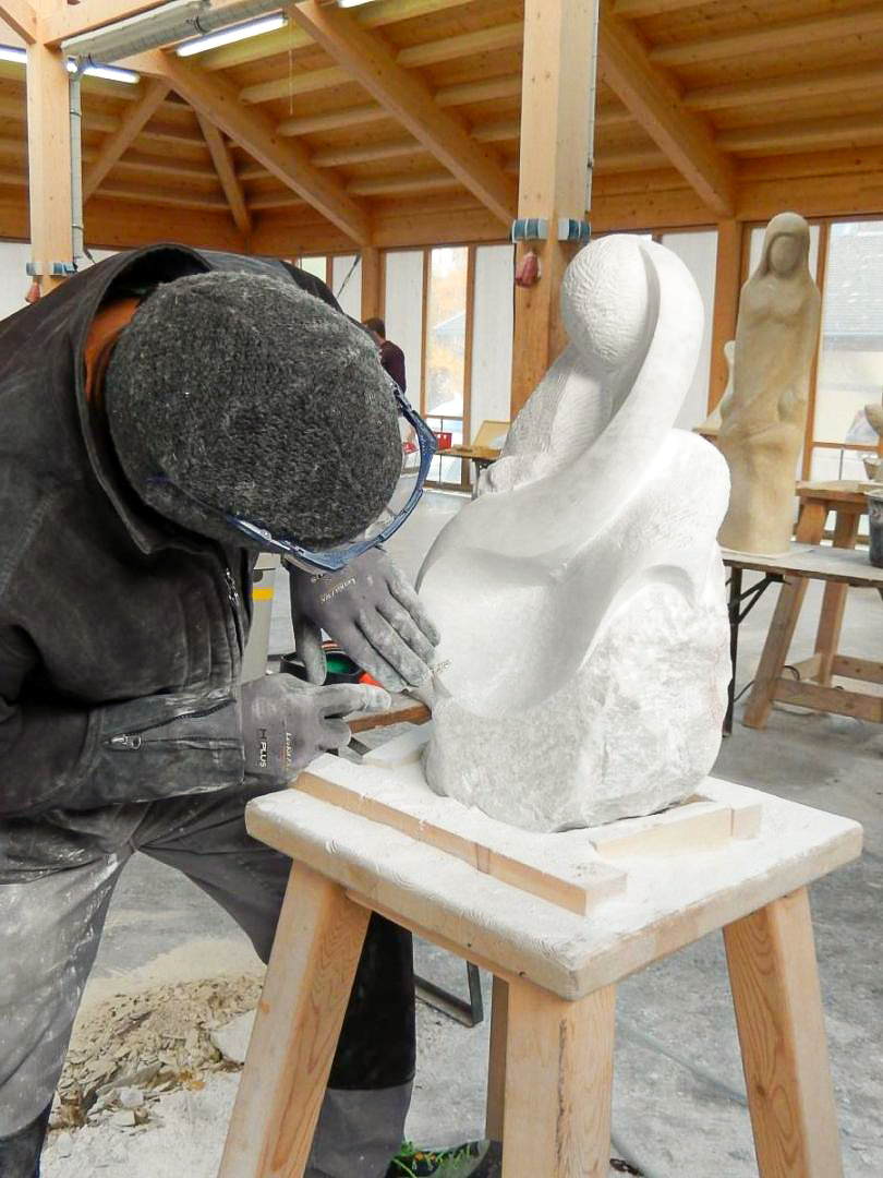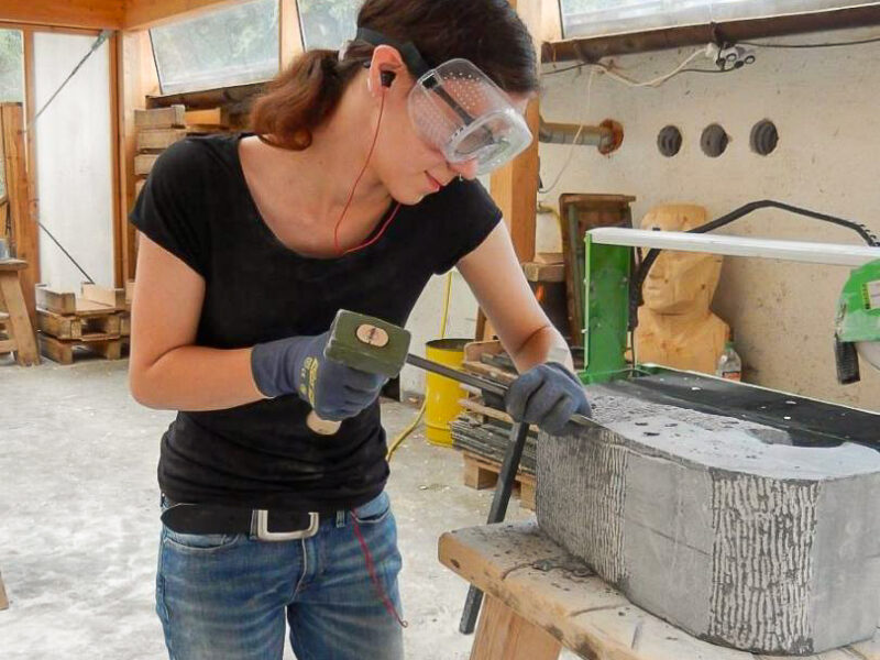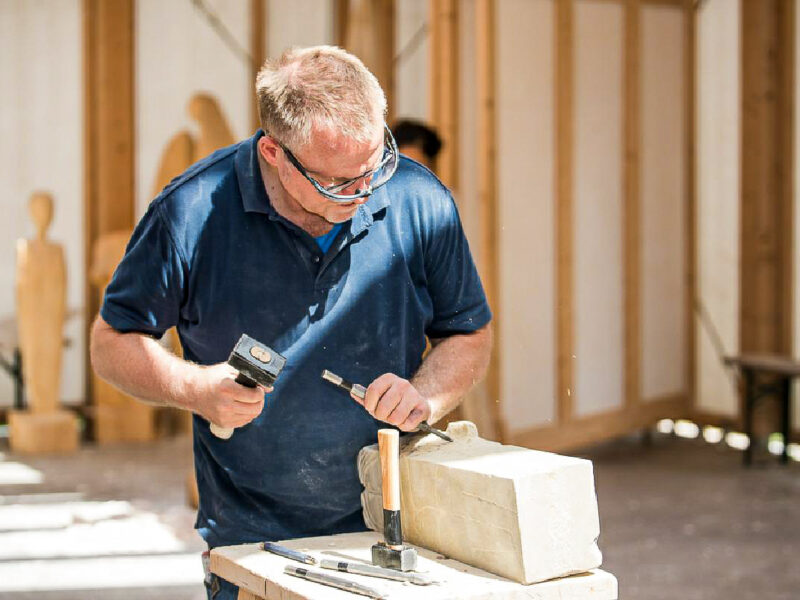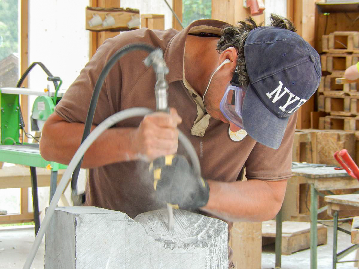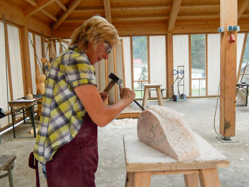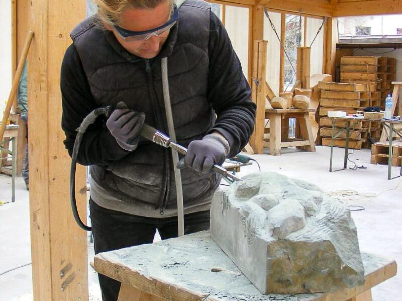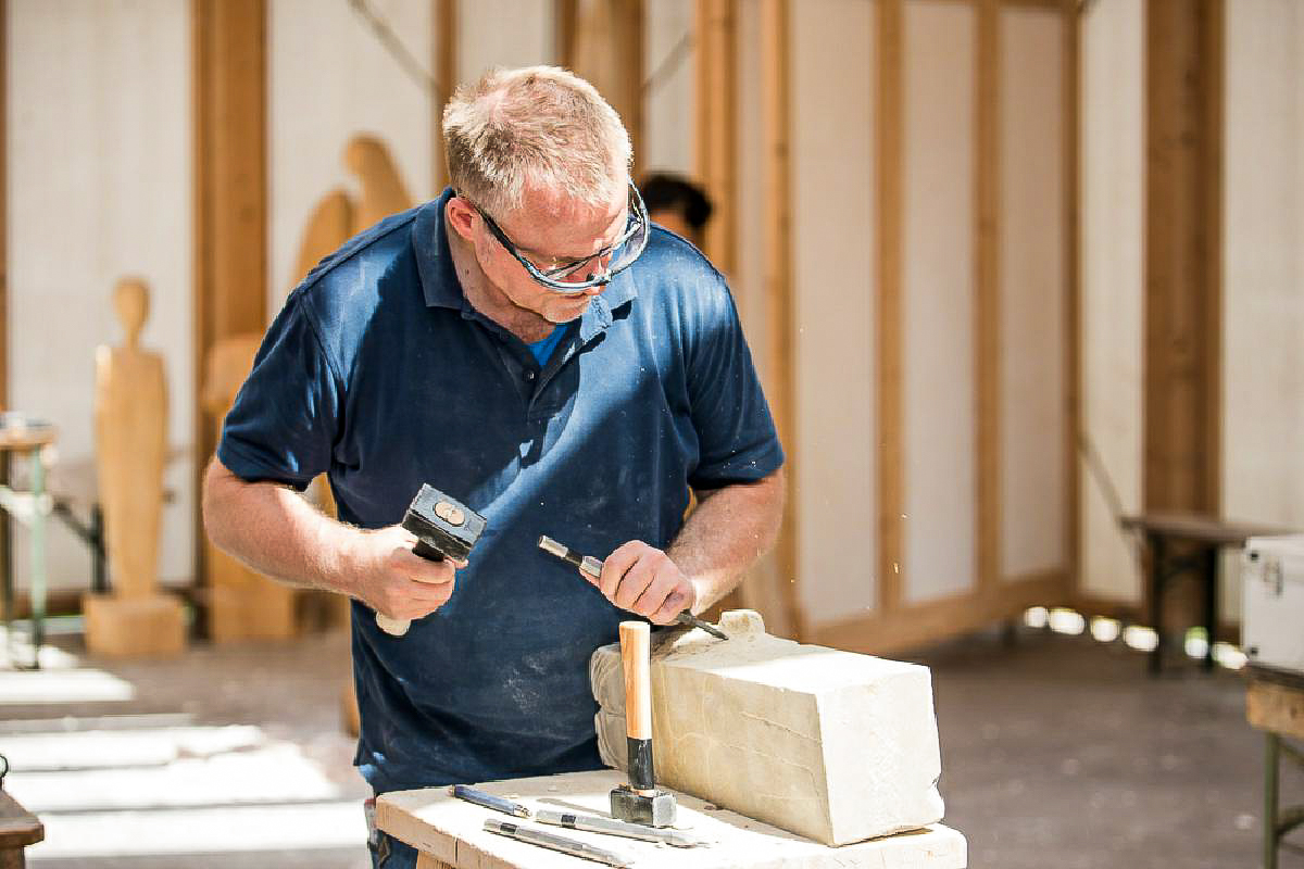 Alle Steinbildhauerkurse finden in unserem Bildhauer-Pavillon statt. Bei den Steinbildhauerkursen wird vorwiegend mit Handwerkzeug gearbeitet. Ergänzend können Sie aber auch Druckluftwerkzeuge einsetzen. Eine Grundausrüstung an Werkzeugen wird jedem Kursteilnehmer zur Verfügung gestellt. Bringen Sie bitte Augen- und Ohrenschutz, Arbeitskleidung