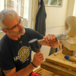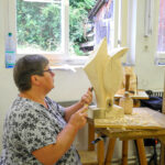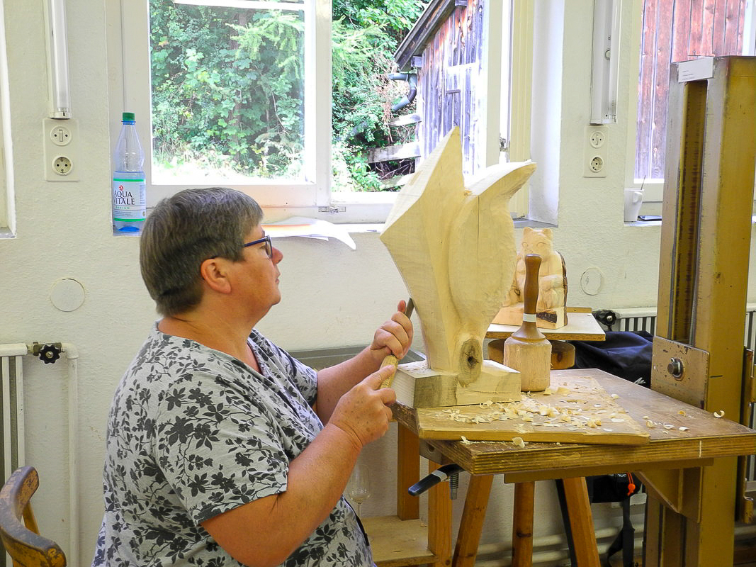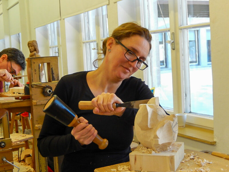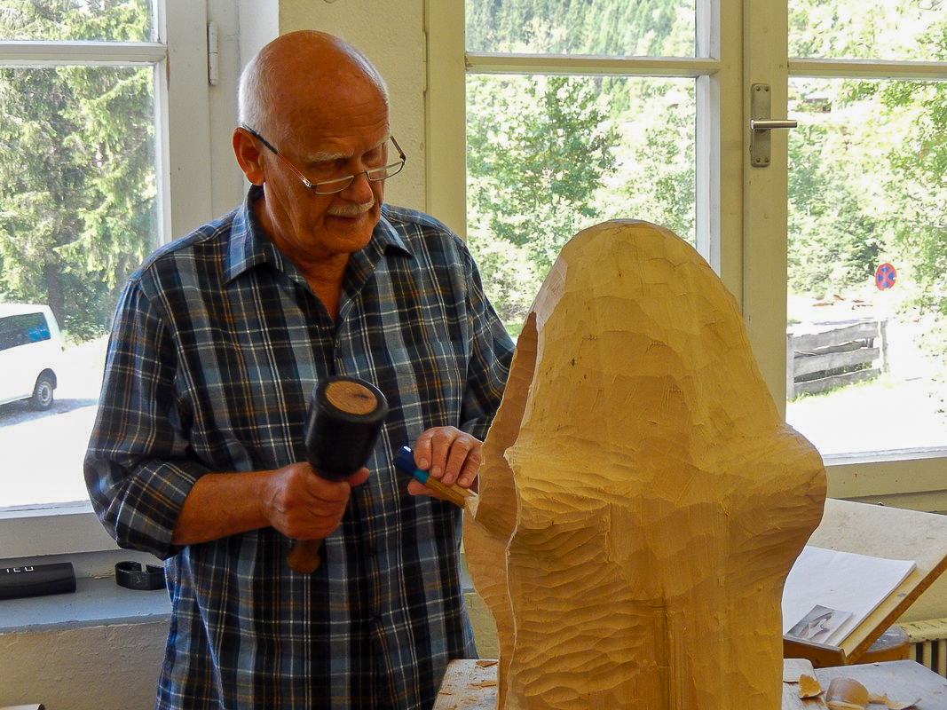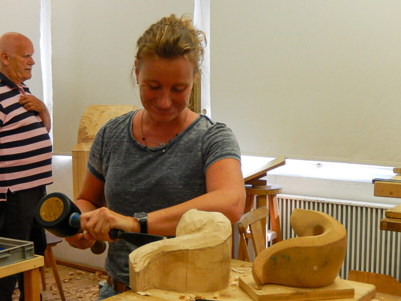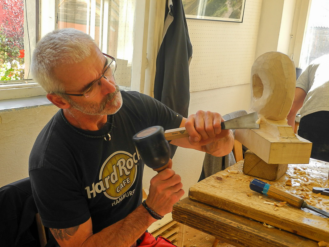 Es wird nicht nach einem Modell gearbeitet, so dass am Anfang noch nicht feststeht, was aus dem Holzblock letztlich für eine Schnitzerei entsteht. Das ergibt sich im Laufe der Arbeit.