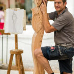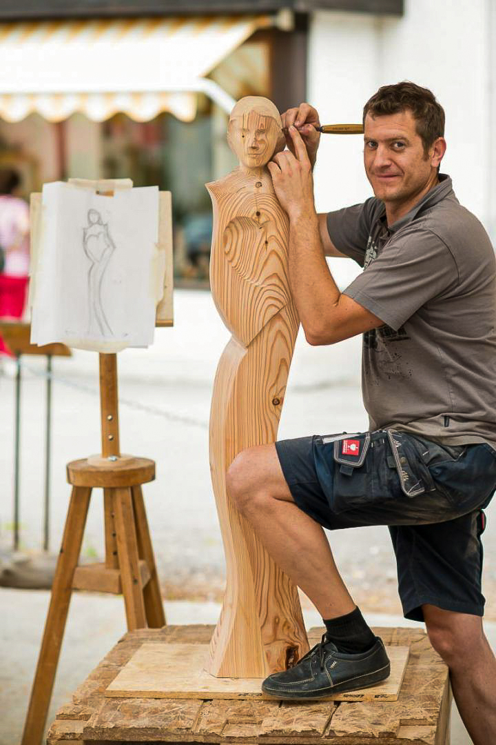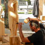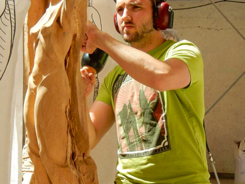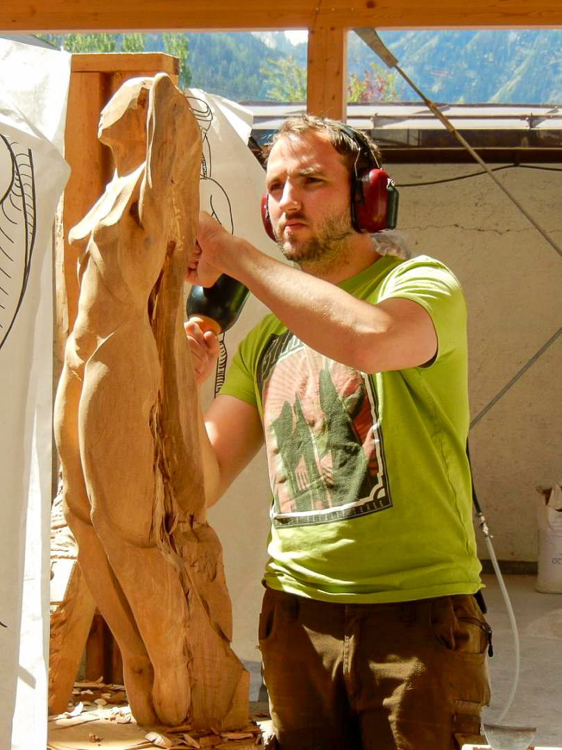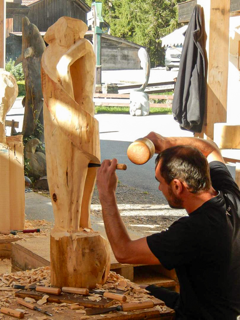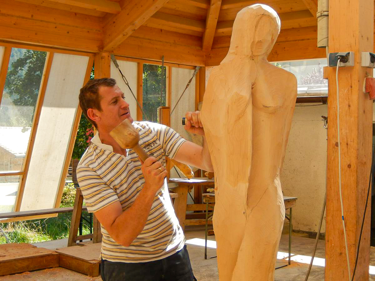 Skulptur wird zunächst herausgearbeitet. Anschließend kommen Knüppel und große Schnitzeisen zum Einsatz oder Sie bearbeiten die Oberfläche mit Raspeln und Schleifwerkzeugen.