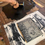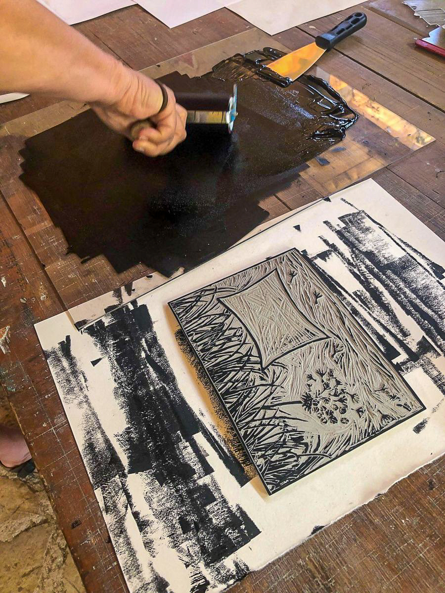 Ihre Ideen halten Sie zunächst zeichnerisch fest, dann erfolgt die Übertragung auf das Medium Holz. Das Spektrum der Hochdrucktechnik reicht vom einfarbigen und mehrfarbigen Druck über das Arbeiten mit verschiedenen Druckstöcken bis hin zum Arbeiten mit der „verlorenen Form“.