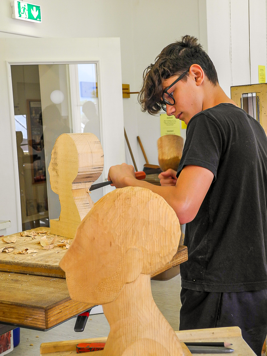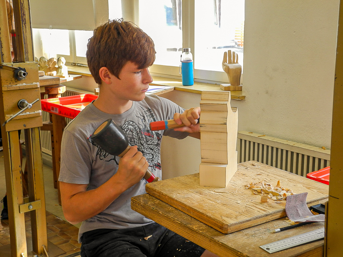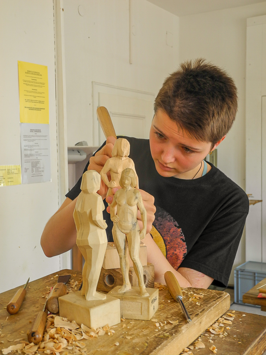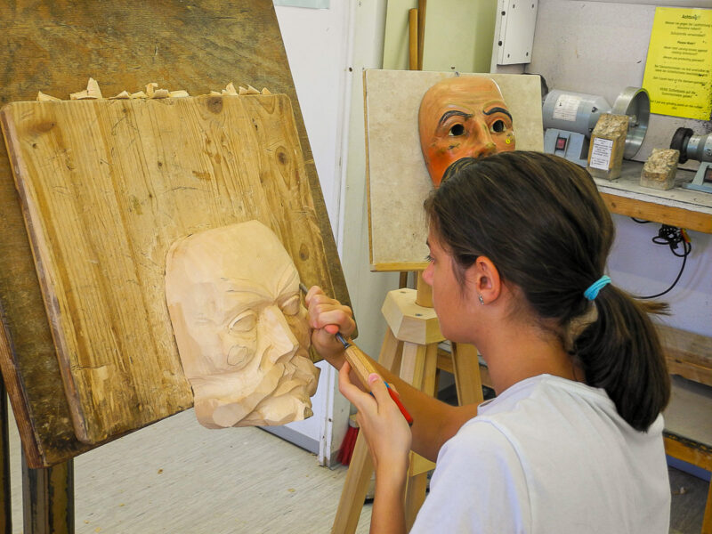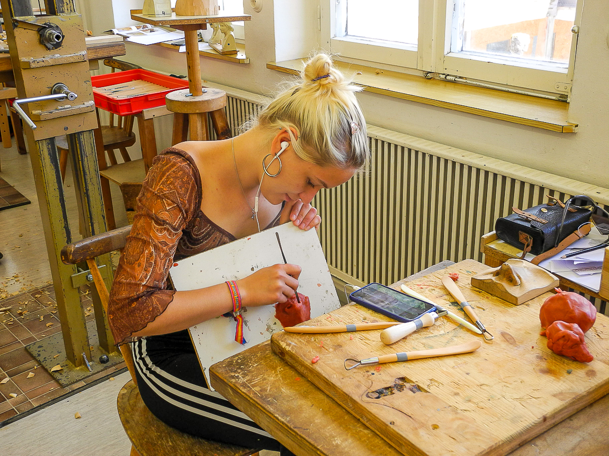 Wir bieten dir das ideale Umfeld, um in alle Bereiche der Bildhauerei einzutauchen. Probiere dich mit den Materialien Holz, Stein und Ton aus und erhalte damit wertvolle Einblicke in dieses facettenreiche Metier. Auch das fachtheoretische Rüstzeug kommt nicht zu kurz: Unerlässliches Basiswissen zu Körperanatomie, Proportionslehre und zur Entwurfszeichnung wird altersgerecht vermittelt.
