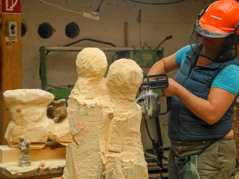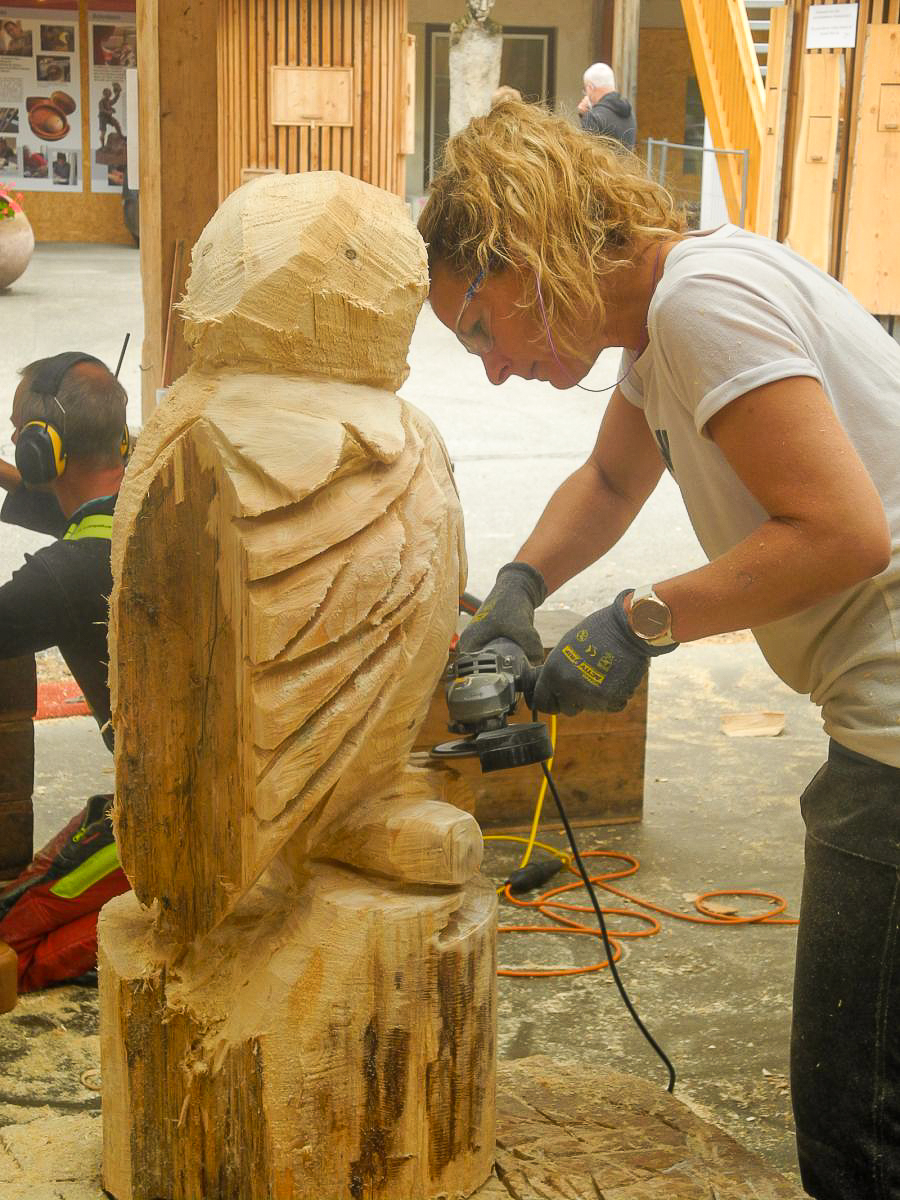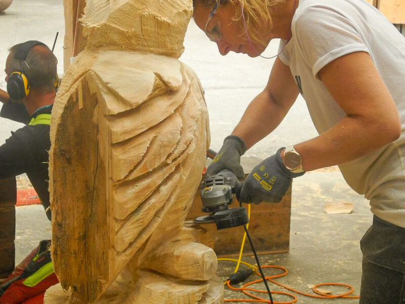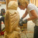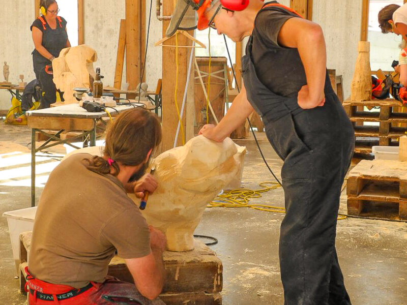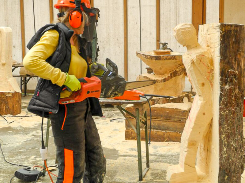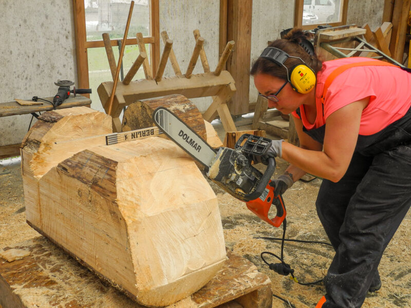 Kettensägenkurs exklusiv für Frauen kreiert. Entscheidend beim Schnitzen mit der Kettensäge ist nicht die Muskelkraft, sondern Feingefühl und die richtige Technik. Um sich genau darauf konzentrieren zu können, wollen wir eine Atmosphäre schaffen, in der sich Frauen ohne Stress und Leistungsdruck ganz ihrem Interesse widmen können. In dieser Umgebung steht dem kreativen Schaffen, dem Austausch mit gleichgesinnten Kursteilnehmerinnen und dem Schließen von neuen Freundschaften nichts mehr im Weg.