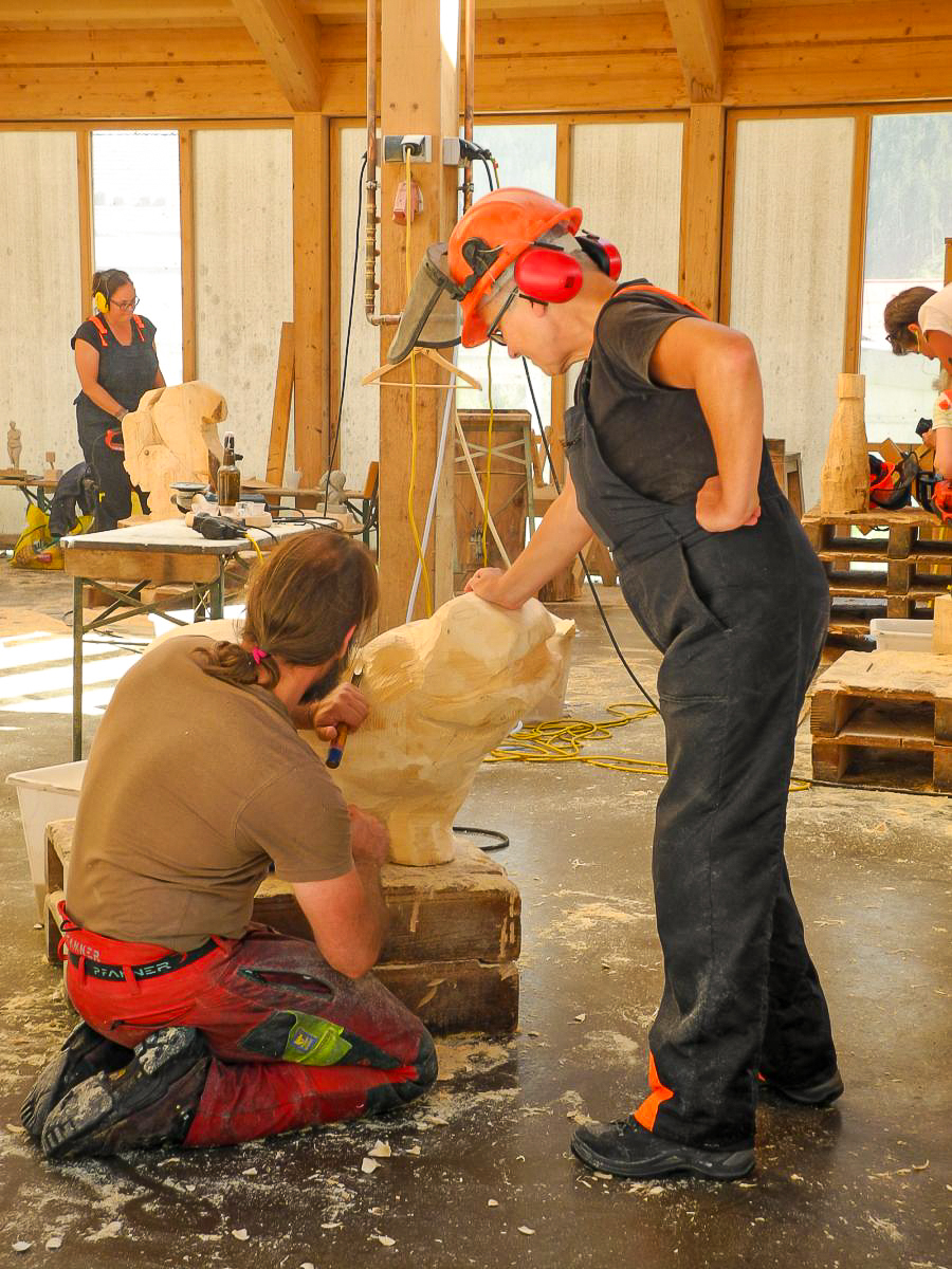 Die Kettensägenkurse finden in unserem Bildhauer-Pavillon statt. Gut geschützt vor Wind und Wetter können Sie dort arbeiten. Bringen Sie bitte – je nach Jahreszeit – warme Arbeitskleidung mit!