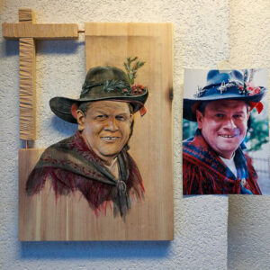 Bringen Sie bitte hochaufgelöste Fotos mit (nur 1 Kopf, wenn möglich mehrere Fotos zur Auswahl). Die Kopfgröße sollte zwischen 12 und 18 cm liegen. Dieser wird 1:1 übertragen und entspricht somit der Originalgröße am Relief. Die fertig geschnitzte Reliefgröße wird ca. 30 x 20 cm betragen.